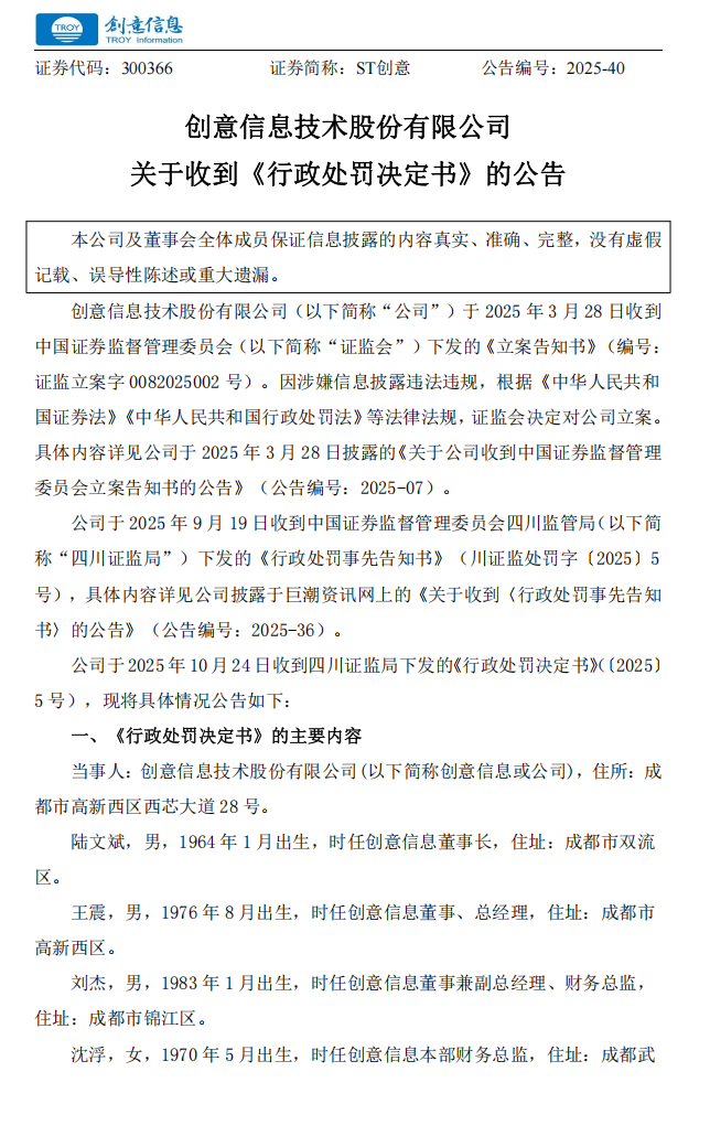 【正式处罚】创意信息收到《行政处罚决定书》的公告(2025/10/24)